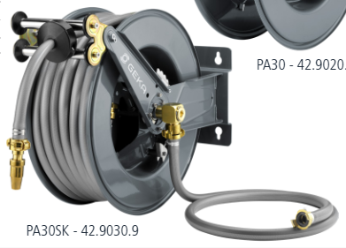 robuste, pulverbeschichtete Stahlkonstruktion automatischer Rückzug des Schlauchs mit schonender Schlauchführung schrittweise Arretierung aus der Distanz durch Zug am Schlauch möglich, fertig montiert und sofort einsatzbereit